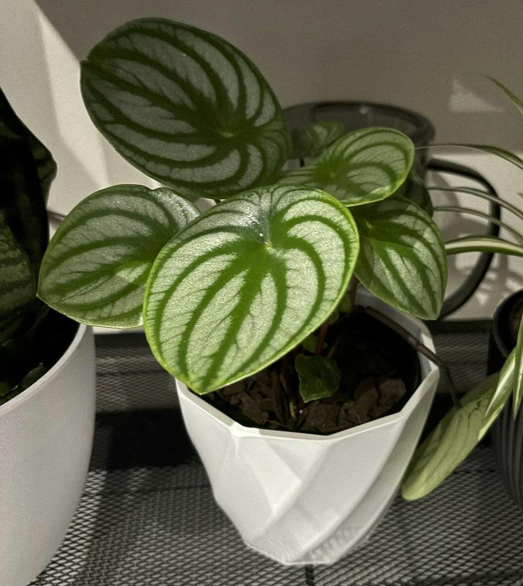 The Watermelon Peperomia (Peperomia argyreia) is a charming, compact houseplant loved for its striking foliage. Its round, fleshy leaves are patterned with silver stripes that resemble the rind of a watermelon, making it a true standout in any collection. This plant stays small and bushy, making it ideal for shelves, desks, or windowsills where space is limited.